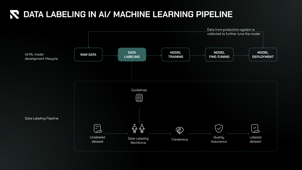 Data labeling is essential in this pipeline, enabling models to learn effectively from high-quality, consistent, and structured data.
