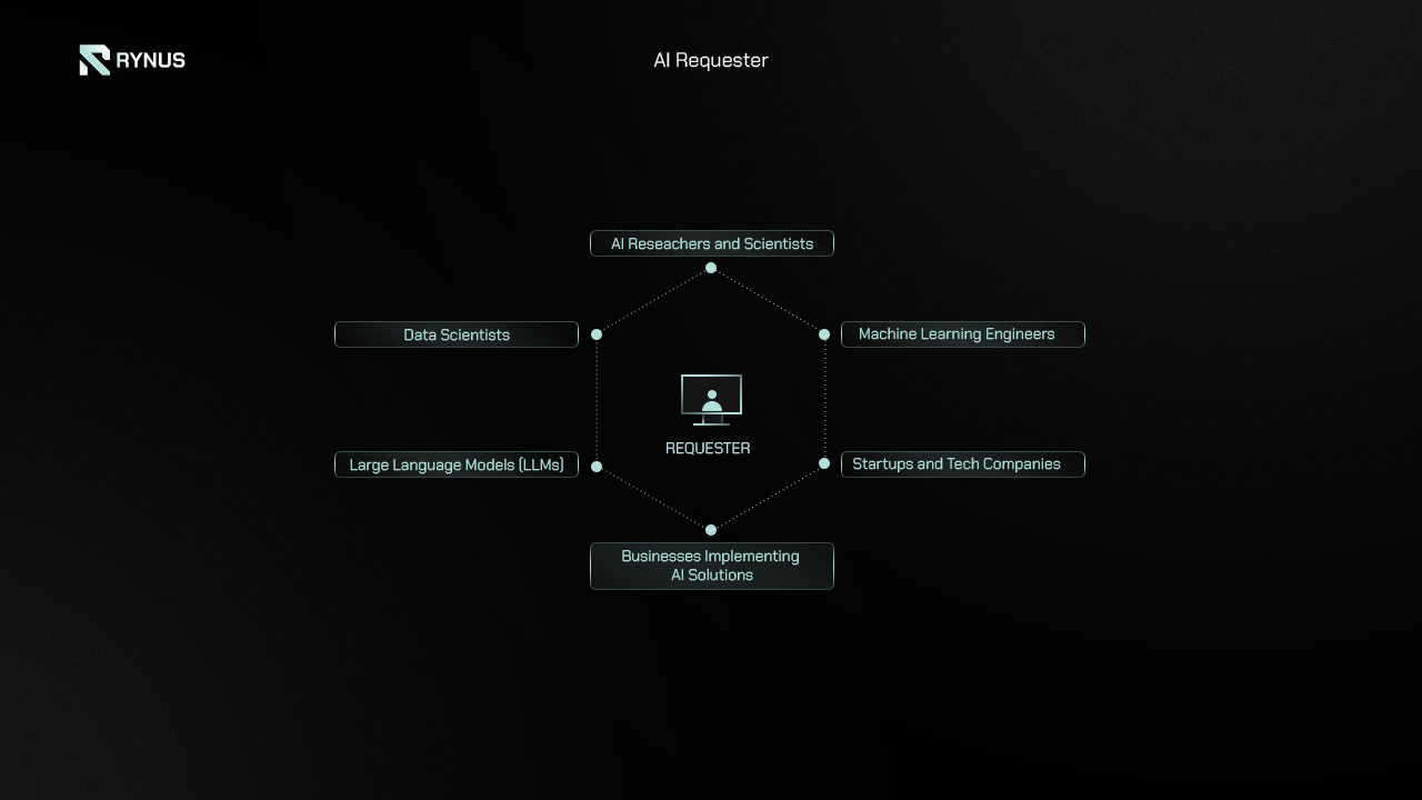In the field of AI, the Requesters using Rynus’s services encompass a broad spectrum of individuals and organizations that require substantial cloud computing power to train their AI models. These include: